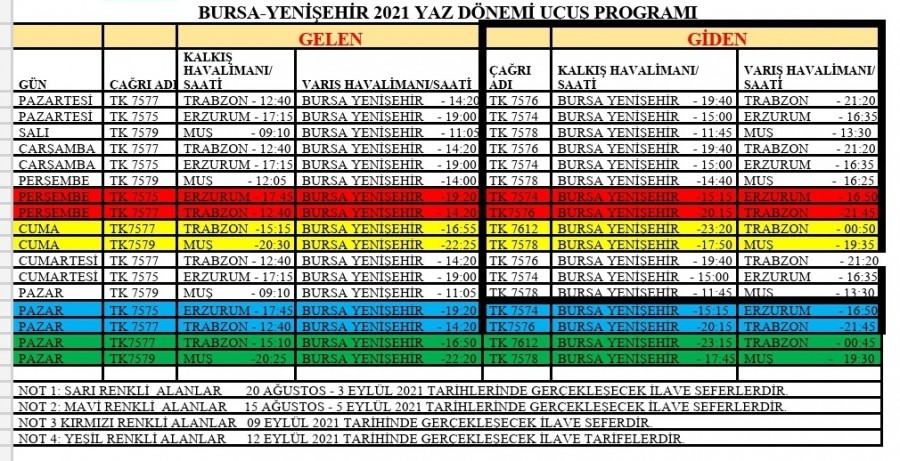 Pandemi sürecindeki normalleşmeyle birlikte yeniden uçuşlara açılan Bursa Yenişehir Havaalanı'nda tüm uçuşlarda yüksek doluluk oranlarının yakalanmasıyla birlikte Erzurum, Muş ve Trabzon uçuşlarına yaz dönemi yeni ek seferler konularak sefer sayıları arttırıldı.