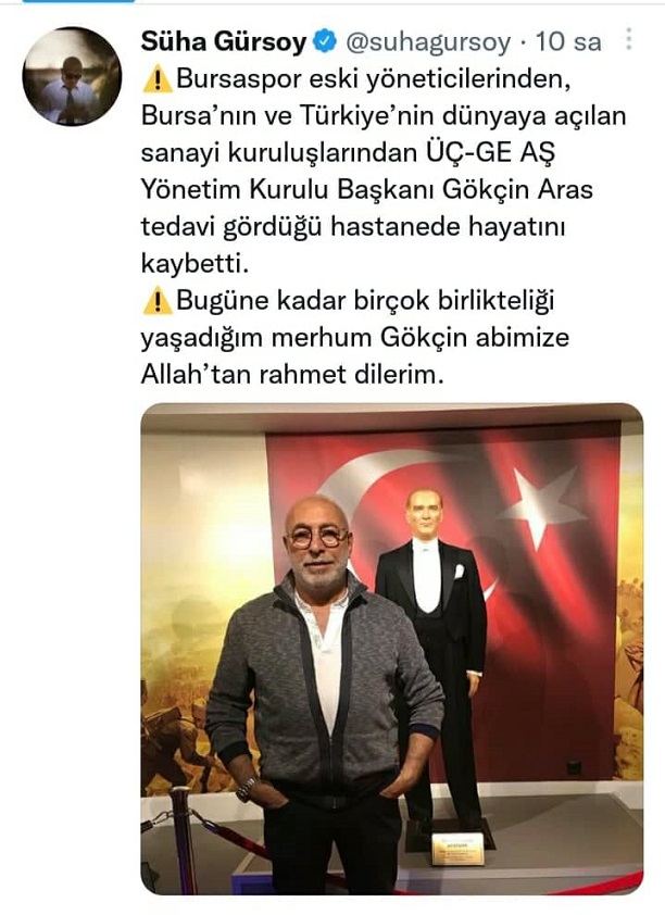 ÜÇGE Şirketler Grubu tarafından yapılan yazılı açıklamada, "ÜÇGE Şirketler Grubu Yönetim Kurulu Başkanımız Gökçin Aras’ı kaybetmenin derin üzüntüsü içindeyiz. Acımız çok büyük. Cenazemiz 19 Ağustos 2022 Cuma günü Bursa Organize Sanayi Bölgesi Camii’nde kılınacak öğle namazını müteakip, Nilüfer Fethiye Kabristanı’na defnedilecektir. Başımız sağ olsun" denildi.