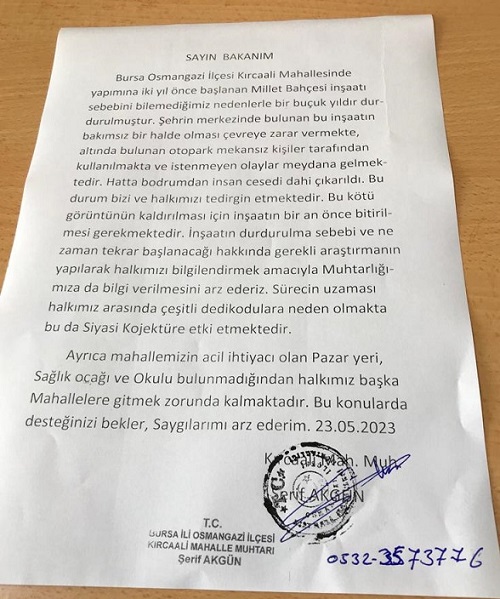 Mahalle muhtarı Sayın Şerif Akgün'ün tarafıma ilettiği ve çok kısa bir süre önce iktidar mensubu bakanlara yazdığı istek, öneri ve sıkıntıları içeren dilekçeyi de size bilgi olarak gönderiyorum.
