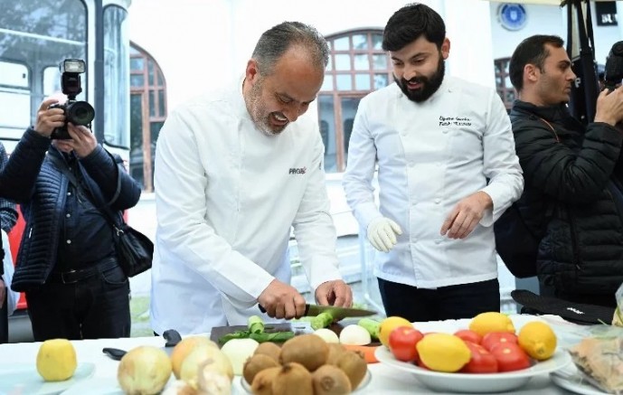 Açılış öncesi Bursa bıçağının yapım aşamasının sahnelendiği gösteri ilgiyle izlenirken, Başkan Aktaş, bıçağın keskinliğini masada sebze doğrayarak test etti.