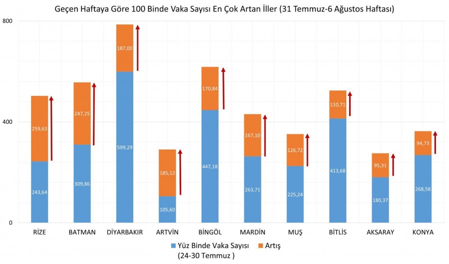 Sağlık Bakanı Koca, 31 Temmuz- 6 Ağustos arasında illere göre her 100 bin kişide görülen Kovid-19 vaka sayılarını açıkladı.