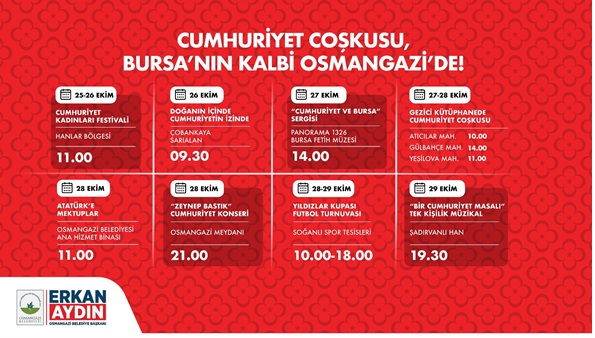Osmangazi Belediyesi, 29 Ekim Cumhuriyet Bayramı kutlamalarının tüm ilçeyi sarması ve vatandaşların 102'nci yıl coşkusunu doyasıya yaşaması için zengin bir program hazırladı. 25 Ekim Cumartesi günü başlayacak ve 29 Ekim Çarşamba günü son bulacak etkinlikler, Osmangazi'nin dört bir yanında renkli görüntülere sahne olacak. Osmangazi Belediye Başkanı Erkan Aydın'ın yenilikçi anlayışıyla hazırlanan kapsamlı program, ilçede Cumhuriyet ruhuna yeni bir soluk kazandıracak.