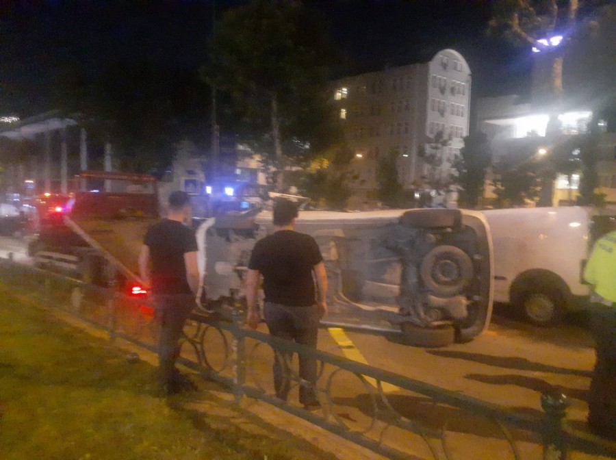 Çarpmanın etkisiyle hafif ticari araç yan yattı.