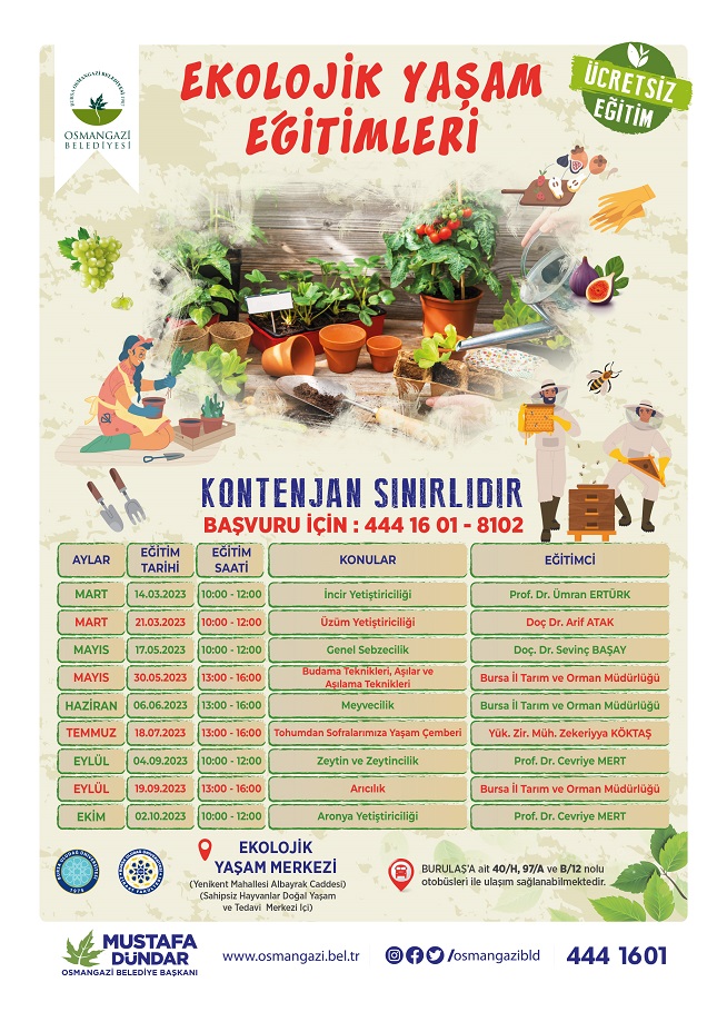 Eğitimlere katılmak isteyen vatandaşların 444 16 01 (dahili 8102) numaralı telefondan ile başvuru yapabileceğini belirten Başkan Dündar, “Türkiye olarak tarıma dayalı gelişen ve büyüyen bir topluma sahibiz. Bizler, bu kapsamda yerli ve milli tohumun yaygınlaştırılması için Ekolojik Yaşam Merkezi projesini hayata geçirdik. Düzenleyeceğimiz eğitimler ile çalışmalarımızı daha ileriye taşımaya karar verdik. Uzman eğiticilerimiz; Mart ayında ‘İncir ve Üzüm Yetiştiriciliği’, Mayıs’ta ‘Genel Sebzecilik, Budama Teknikleri, Aşılar ile Aşılama Teknikleri’, Haziran’da ‘Meyvecilik’, Temmuz’da ‘Tohumdan Sofralarımıza Yaşam Çemberi’, Eylül’de ‘Zeytin, Zeytincilik, Arıcılık’, Ekim’de de ‘Aronya Yetiştiriciliği’ konularını ele alacak. Oldukça verimli geçeceğine inandığım eğitimler ile vatandaşlarımız doğal ürünler yetiştirmiş olacak” dedi.