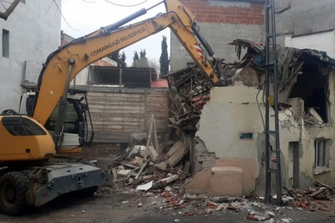 Osmangazi Belediyesi, halkın can ve mal güvenliğini tehdit etmesinin yanı sıra madde bağımlılarının mesken tutması nedeniyle de yoğun şikayetlere konu olan metruk binaların yıkımını sürdürüyor. Mahallelerde yaşayan halkı oldukça tedirgin eden metruk binalar, Yapı Kontrol Müdürlüğü ekipleri tarafından durum tespiti yapılıp, yasal işlemlerinin tamamlanmasının ardından yıkılıyor. Vatandaşlardan gelen talep ve şikayetleri dikkate alan belediye ekipleri, İvazpaşa Mahallesi'nde yer alan metruk binayı yıkmak için harekete geçti. Emniyet ve sağlık açısından risk oluşturan metruk bina, iş makinesi ile yıkıldı. Yıkımın ardından ortaya çıkan molozlar, belediye ekipleri tarafından kamyonlara yüklenerek yıkım alanı temizlendi.