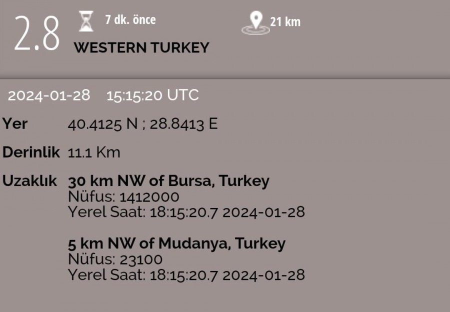 Edinilen bilgilere göre, Bursa'da Mudanya merkezli 2.8 büyüklüğünde bir deprem meydana geldi.