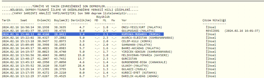 Kandilli Rasathanesi'nin verilerine göre, saat 15:40'ta merkez üssü Bursa'nın Mudanya ilçesi Kumyaka mahallesi olan 2.1 büyüklüğünde deprem meydana geldi.