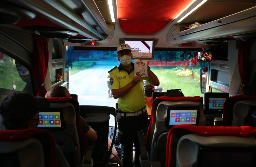 Ekipler yolculara, İçişleri Bakanlığınca "Yol ver hayata" sloganıyla hazırlanan broşürleri dağıtıyor.