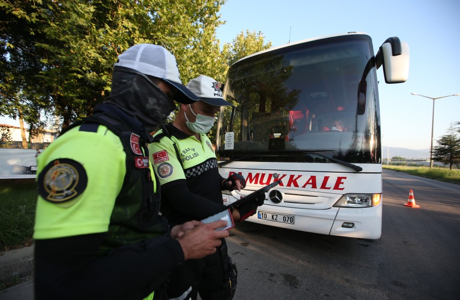 Otobüsleri sigorta, muayene, yetki belgesi, lastik derinliği yönünden inceleyen ekipler, araçlara binerek yolculara da maske ve mesafe kurallarına uymaları konusunda uyarılarda bulunuyor.