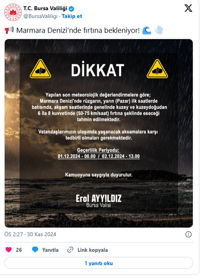 "Denizlerimizde fırtına bekleniyor." diyerek, sosyal medya üzerinden paylaştığı mesajda şu ifadeleri kullandı: Yapılan son meteorolojik değerlendirmelere göre Marmara Denizi'nde rüzgarın yarın, ilk saatlerde batısında, akşam saatlerinde genelinde kuzey ve kuzeydoğudan 6 ila 8 kuvvetinde fırtına şeklinde eseceği tahmin edilmektedir. Vatandaşlarımızın ulaşımda yaşanacak aksamalara karşı tedbirli olmaları gerekmektedir."