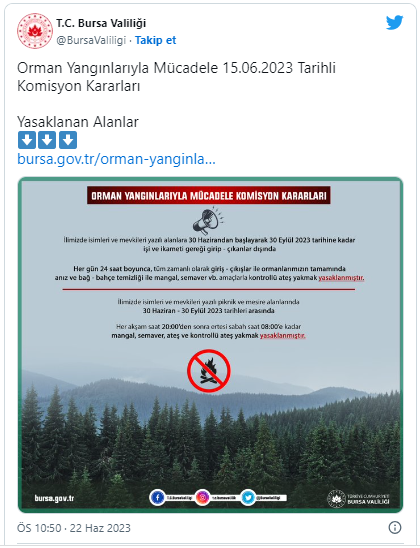 Bursa Valiliği orman yangınlarıyla mücadele kapsamında aldığı yeni tedbirleri açıkladı. Valilik genelgede belirlenen bölgelerde belirtilen saatler dışında ateş yakmayı yasakladı.