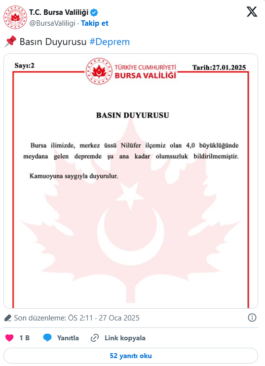 Bursa Valiliği meydana gelen depremde olumsuz bir durum olmadığını bildirdi.