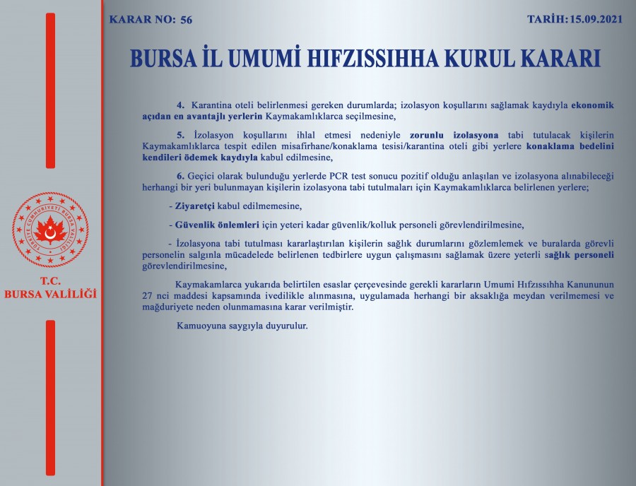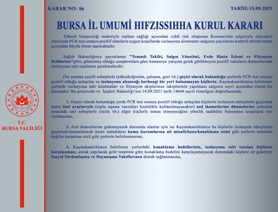 Öte yandan çeşitli sebeplerle (yükseköğretim, çalışma, gezi vb.) geçici olarak bulunduğu yerlerde PCR test sonucu pozitif olduğu anlaşılan ve izolasyona alınacağı herhangi bir yeri bulunmayan kişilerin; Kaymakamlıklarca belirlenen yerlerde izolasyona tabi tutulmaları ve filyasyon ekiplerince takiplerinin yapılması salgının seyri açısından elzem bir durumdur. Bu çerçevede ve İçişleri Bakanlığı'nın 14.09.2021 tarih 14644 sayılı Genelgesi doğrultusunda;