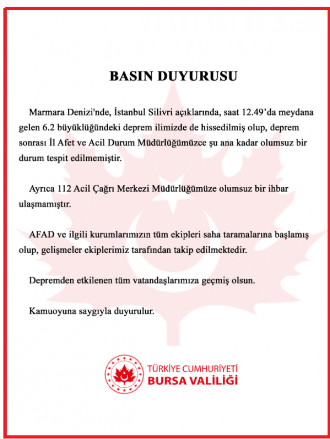 "Marmara Denizi'nde, İstanbul Silivri açıklarında, saat 12.49'da meydana gelen 6.2 büyüklüğündeki deprem ilimizde de hissedilmiş olup, deprem sonrası İl Afet ve Acil Durum Müdürlüğümüzce şu ana kadar olumsuz bir durum tespit edilmemiştir.