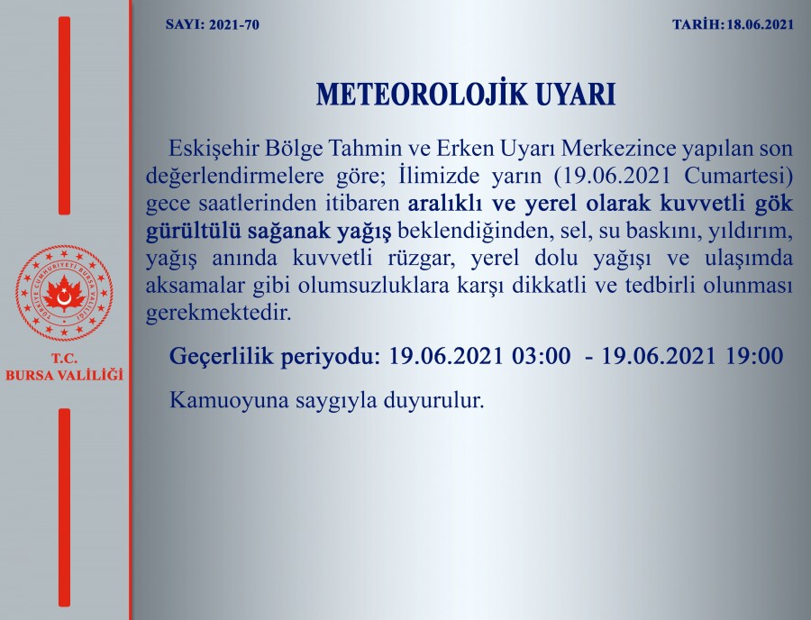 Eskişehir Bölge Tahmin ve Erken Uyarı Merkezince yapılan son değerlendirmelere göre; İlimizde yarın (19.06.2021 Cumartesi 03.00) gece saatlerinden itibaren aralıklı ve yerel olarak kuvvetli gök gürültülü sağanak yağış beklendiğinden, sel, su baskını, yıldırım, yağış anında kuvvetli rüzgar, yerel dolu yağışı ve ulaşımda aksamalar gibi olumsuzluklara karşı dikkatli ve tedbirli olunması gerekmektedir.