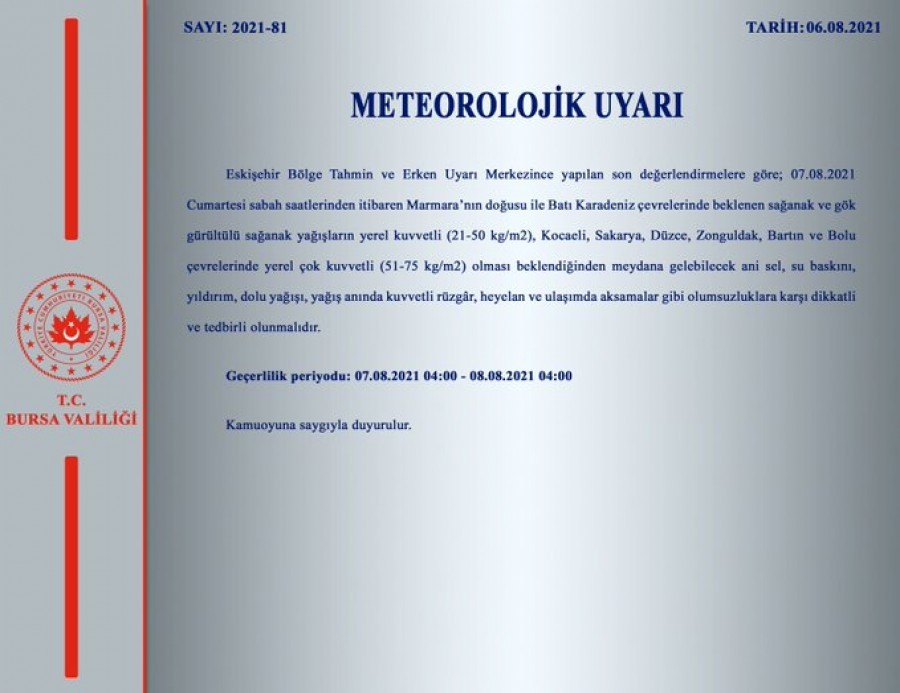 "Eskişehir Bölge Tahmin ve Erken Uyarı Merkezince yapılan son değerlendirmelere göre: 07.08.2021 Cumartesi sabah saatlerinden itibaren Marmara'nın doğusu ile Batı Karadeniz çevrelerinde beklenen sağanak ve gök gürültülü sağanak yağışların yerel kuvvetli (21-50 kg/m2), Kocaeli, Sakarya, Düzce, Zonguldak, Bartın ve Bolu çevrelerinde yerel çok kuvvetli (51-75 kg/m2) olması beklendiğinden meydana gelebilecek ani sel, su baskını, yıldırım, dolu yağış yağış anında kuvvetli rüzgâr, heyelan ve ulaşımda aksamalar gibi olumsuzluklara karşı dikkatli ve tedbirli olunmalıdır.