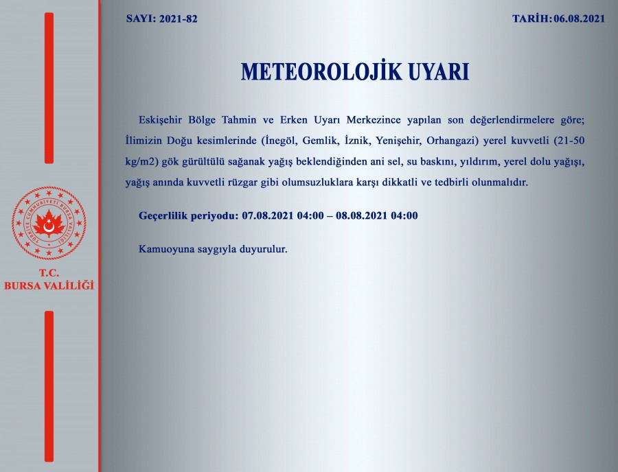 Eskişehir Bölge Tahmin ve Erken Uyarı Merkezince yapılan son değerlendirmelere göre; İlimizin Doğu kesimlerinde (İnegöl, Gemlik, İznik, Yenişehir, Orhangazi) yerel kuvvetli (21-50 kg/m2) gök gürültülü sağanak yağış beklendiğinden ani sel, su baskını, yıldırım, yerel dolu yağışı, yağış anında kuvvetli rüzgar gibi olumsuzluklara karşı dikkatli ve tedbirli olunmalıdır.