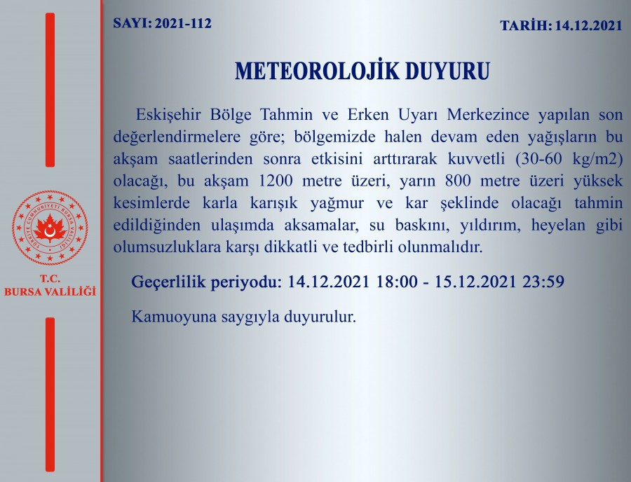 Eskişehir Bölge Tahmin ve Erken Uyarı Merkezince yapılan son değerlendirmelere göre; bölgemizde halen devam eden yağışların bu akşam saatlerinden sonra etkisini arttırarak kuvvetli (30-60 kg/m2) olacağı, bu akşam 1200 metre üzeri, yarın 800 metre üzeri yüksek kesimlerde karla karışık yağmur ve kar şeklinde olacağı tahmin edildiğinden ulaşımda aksamalar, su baskını, yıldırım, heyelan gibi olumsuzluklara karşı dikkatli ve tedbirli olunmalıdır.
