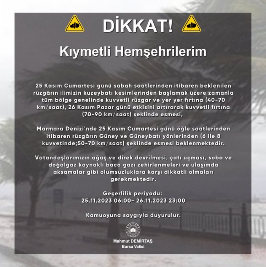 Kıymetli Hemşehrilerim 25 Kasım Cumartesi günü sabah saatlerinden itibaren beklenilen rüzgârın ilimizin kuzeybatı kesimlerinden başlamak üzere zamanla tüm bölge genelinde kuvvetli rüzgar ve yer yer fırtına (40-70 km/saat), 26 Kasım Pazar günü etkisini artırarak kuvvetli fırtına (70-90 km/saat) şeklinde esmesi, Marmara Denizi'nde 25 Kasım Cumartesi günü öğle saatlerinden itibaren rüzgârın Güney ve Güneybatı yönlerinden (6 ile 8 kuvvetinde;50-70 km/saat) şeklinde esmesi beklenmektedir.