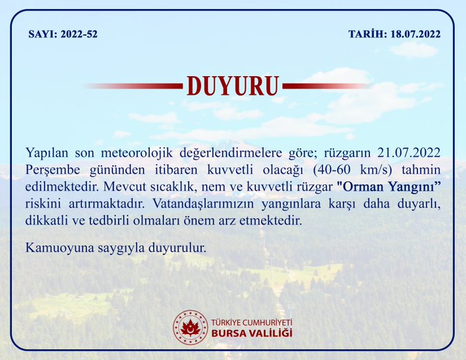 Yapılan son meteorolojik değerlendirmelere göre; rüzgarın 21.07.2022 Perşembe gününden itibaren kuvvetli olacağı (40-60 km/s) tahmin edilmektedir. Mevcut sıcaklık, nem ve kuvvetli rüzgar "Orman Yangını" riskini artırmaktadır. Vatandaşlarımızın yangınlara karşı daha duyarlı, dikkatli ve tedbirli olmaları önem arz etmektedir.