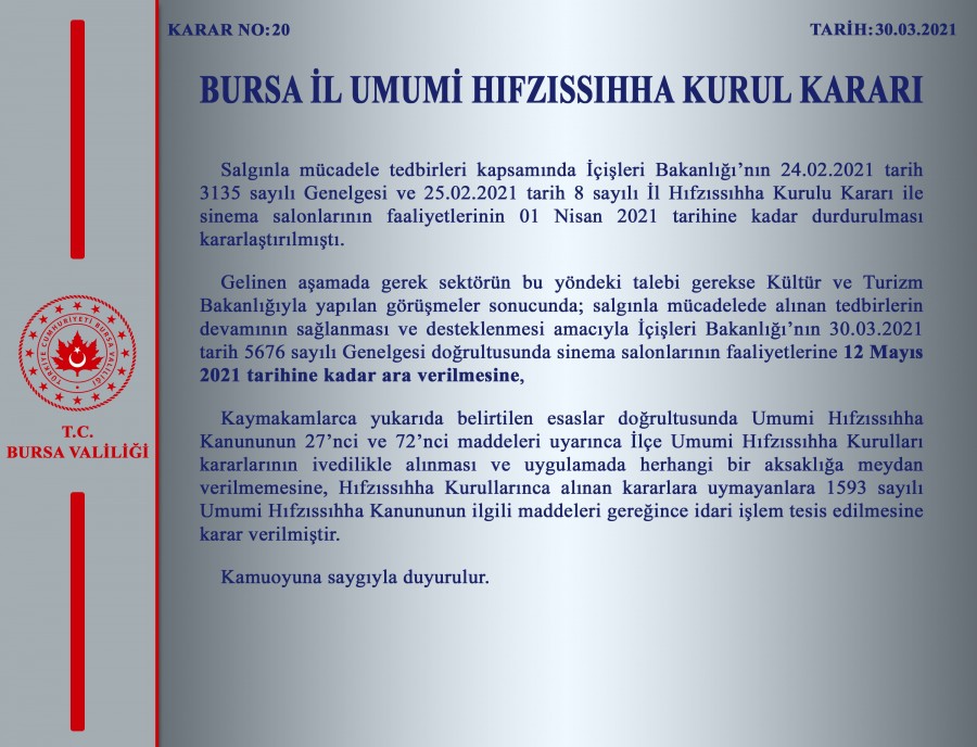 "Salgınla mücadele tedbirleri kapsamında İçişleri Bakanlığı'nın 24.02.2021 tarih 3135 sayılı Genelgesi ve 25.02.2021 tarih 8 sayılı İl Hıfzıssıhha Kurulu Kararı ile sinema salonlarının faaliyetlerinin 01 Nisan 2021 tarihine kadar durdurulması kararlaştırılmıştı.