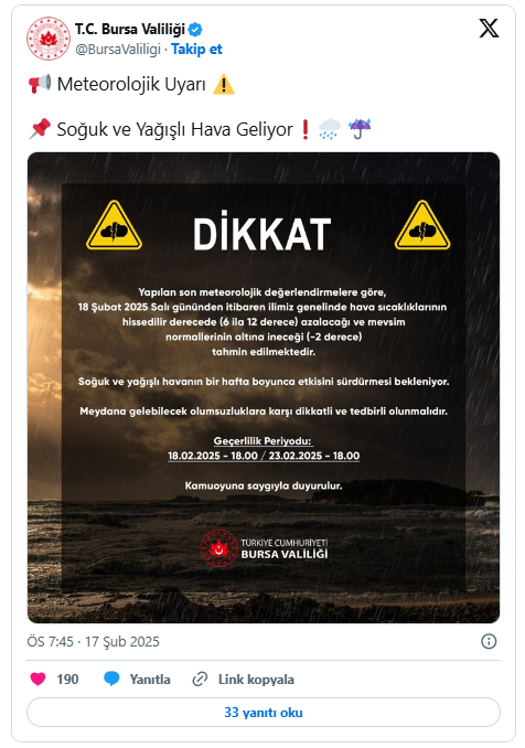 Bursa Valiliği resmi sosyal medya hesabı üzerinden Bursalıları soğuk havaya karşı uyardı. Yapılan açıklamada, soğuk ve yağışlı havanın bir hafta boyunca devam edeceği belirtildi.