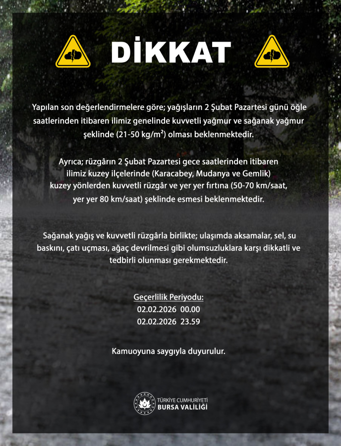 Ayrıca; rüzgârın 2 Şubat Pazartesi gece saatlerinden itibaren ilimiz kuzey ilçelerinde (Karacabey, Mudanya ve Gemlik) kuzey yönlerden kuvvetli rüzgâr ve yer yer fırtına (50-70 km/saat, yer yer 80 km/saat) şeklinde esmesi beklenmektedir.
