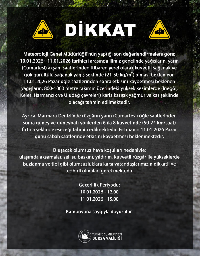 11.01.2026 Pazar öğle saatlerinden sonra etkisini kaybetmesi beklenen yağışların; 800-1000 metre rakımın üzerindeki yüksek kesimlerde (İnegöl, Keles, Harmancık ve Uludağ çevreleri) karla karışık yağmur ve kar şeklinde olacağı tahmin edilmektedir.