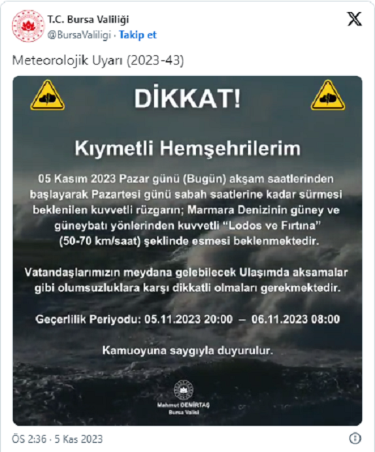 Bursa Valiliği, sosyal medya hesaplarından yapılan paylaşım şöyle: