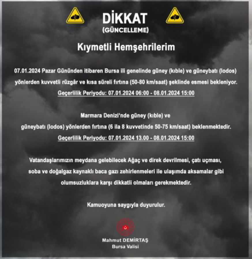 Demirtaş'ın uyarısı şu şekilde; "07.01.2024 Pazar Gününden itibaren Bursa ili genelinde güney (kible) ve güneybatı (lodos) yönlerden kuvvetli rüzgâr ve kısa süreli fırtına (50-80 km/saat) şeklinde esmesi bekleniyor. Geçerlilik Periyodu: 07.01.2024 06:00 - 08.01.2024 15:00