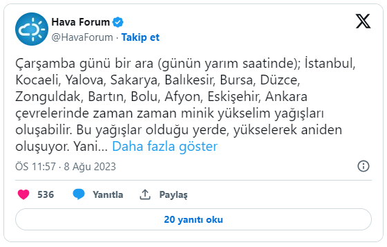 Çarşamba günü bir ara (günün yarım saatinde); İstanbul, Kocaeli, Yalova, Sakarya, Balıkesir, Bursa, Düzce, Zonguldak, Bartın, Bolu, Afyon, Eskişehir, Ankara çevrelerinde zaman zaman minik yükselim yağışları oluşabilir. Bu yağışlar olduğu yerde, yükselerek aniden oluşuyor. Yani bazı ilçelerde parçalı bulutlu hava olurken bazı ilçelerde yağmur geçişleri görebiliriz. Radar takibi yapacağız. Buralarda hava genelde parçalı bulutlu ve rüzgarlı olacak.