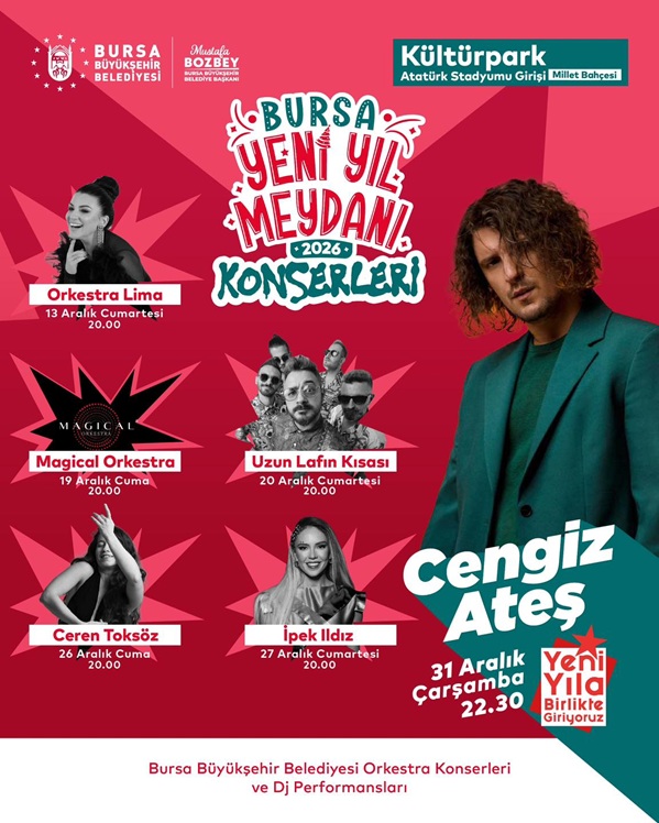 Vatandaşların huzur ve güven içerisinde 2026’yı karşılayabilmeleri için Bursa Kültür AŞ ve ilgili birimleriyle hazırlıklarını sürdüren Bursa Büyükşehir Belediyesi, yeni yılın büyük bir coşkuyla karşılanması için Eski Atatürk Stadyumu alanında ‘Bursa Yeni Yıl Meydanı’nı oluşturdu.