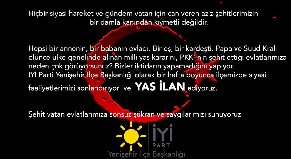 BURSA (İGFA) - Gara'da şehit edilen 13 vatan evladının acısı tüm ülkeyi hüzne boğarken, Bursa'nın Yenişehir ilçesinde İYİ Parti Teşkilatı, bir hafta boyunca ilçedeki siyasi faaliyetleri durdurma kararı aldı.