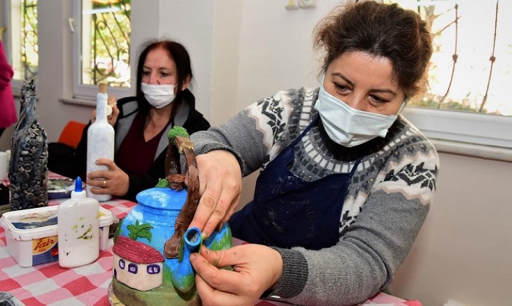 Güllük Mahallesi Hanımlar Lokali’nde haftanın 5 günü verilen kurslarda, kursiyerler evlerinde kullanmadıkları atıkları getirerek birbirinden farklı renkli ürünler ortaya koyuyor. Ev ekonomilerine katkı sağlayan kadınlar aynı zamanda israfın önüne geçerek kaynakların daha verimli kullanılmasını sağlıyor.