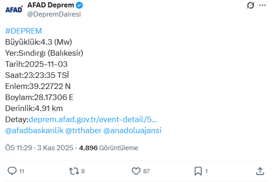 Balıkesir Sındırgı'da meydana gelen depremin yerin 4.91 kilometre altında gerçekleştiği açıklandı.