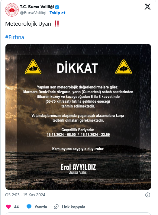 Bursa Valiliği'nin sosyal medya hesabından yaptığı paylaşıım şu şekilde: