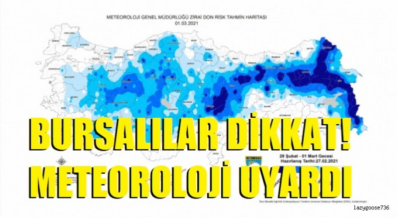 Meteoroloji Genel Müdürlüğünden alınan verilere göre, bugün Bursa yağmurlu, sıcaklığın ise en yüksek 9, en düşük 5 derece olması tahmin ediliyor. Ayrıca hava sıcaklığının bu gece sıfırın altında 3 dereceye kadar düşmesi beklenen Bursa'da çiftçiler içinde hafif, yer yer kuvvetli ve çok kuvvetli olmak üzere zirai don uyarısı yapıldı.