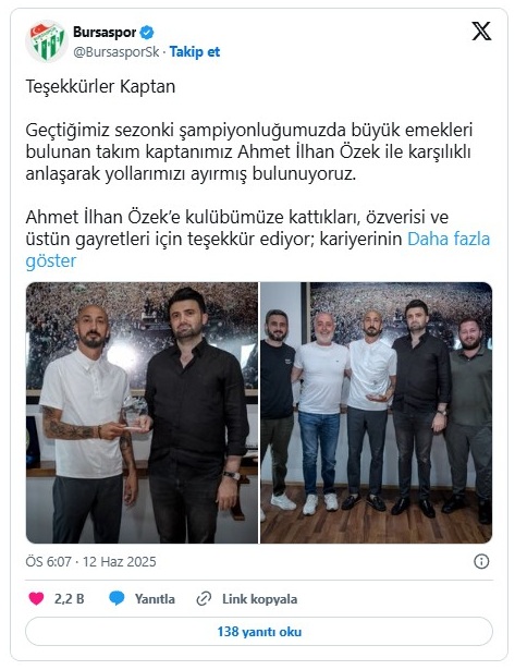 Bursaspor önemli bir haberi resmi sosyal medya hesabından yayımladı. Yeşil beyazlı takım kaptanı Ahmet İlhan Özek ile yollarını ayırdı. Yapılan duyuruda, "Teşekkürler Kaptan Geçtiğimiz sezonki şampiyonluğumuzda büyük emekleri bulunan takım kaptanımız Ahmet İlhan Özek ile karşılıklı anlaşarak yollarımızı ayırmış bulunuyoruz. Ahmet İlhan Özek'e kulübümüze kattıkları, özverisi ve üstün gayretleri için teşekkür ediyor; kariyerinin bundan sonraki döneminde kendisine başarılar diliyoruz" bilgisi verildi.