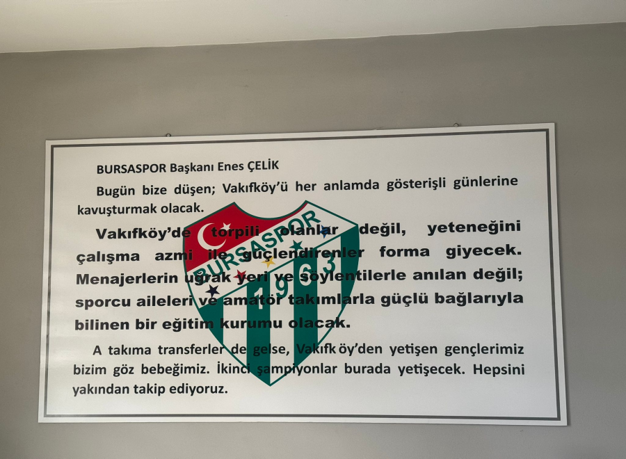 Duvarda Başkan Çelik'in "Bugün bize düşen; Vakıfköy'ü her anlamda yeniden gösterişli günlerine kavuşturmak olacak. Vakıfköy'de artık torpili olanlar değil; yeteneğini, çalışma azmi ile karakterini güçlendirenler forma giyecek. Menajerlerin yeri ve söylentilerle anılan değil; sporcu aileleri ve amatör takımlarla güçlü bağlarıyla bilinen bir eğitim kurumu olacak. A takıma transferler de gelse, Vakıfköy'den yetişen gençlerimiz bizim göz bebeğimizdir. İkinci şampiyonlar yine burada yetişecek. Hepsini yakından takip ediyoruz" sözleri yer aldı.