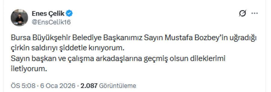 Enes Çelik, sosyal medya hesabından konuyla ilgili yaptığı açıklamada, "Bursa Büyükşehir Belediye Başkanımız Sayın Mustafa Bozbey'in uğradığı çirkin saldırıyı şiddetle kınıyorum. Sayın başkan ve çalışma arkadaşlarına geçmiş olsun dileklerimi iletiyorum." ifadelerine yer verdi.