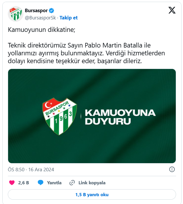 Bursaspor sosyal medya hesabından yaptığı açıklamada Teknik Direktör Batalla ile yollarını ayırdığını duyurdu. Yapılan açıklamada, "Kamuoyunun dikkatine; Teknik direktörümüz Sayın Pablo Martin Batalla ile yollarımızı ayırmış bulunmaktayız. Verdiği hizmetlerden dolayı kendisine teşekkür eder, başarılar dileriz" dendi.