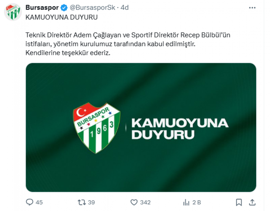 Bursaspor'un resmi sosyal medya hesabından yapılan açıklamada Adem Çağlayan'ın istifasının kabul edildiği duyuruldu.