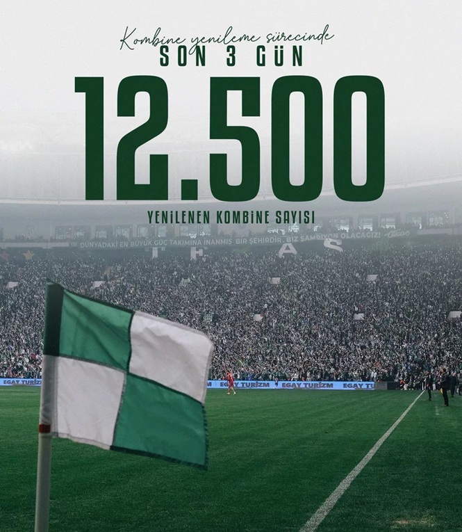 Bursaspor’da yeni sezon öncesi kombine heyecanı sürüyor. Kulüpten yapılan açıklamaya göre, 30 Mart’ta başlayan kombine yenileme sürecinde şu ana kadar toplam 12 bin 500 kombine yenilendi.