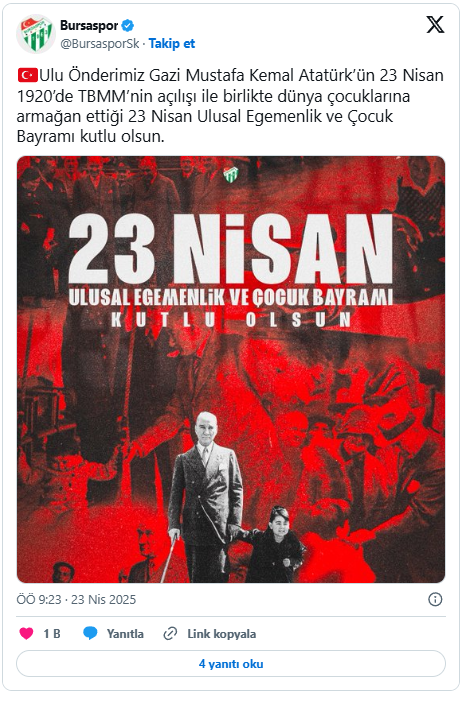 Bursaspor sosyal medya hesabından, 23 Nisan Ulusal Egemenlik ve Çocuk Bayramı dolayısıyla bir mesaj yayımladı.