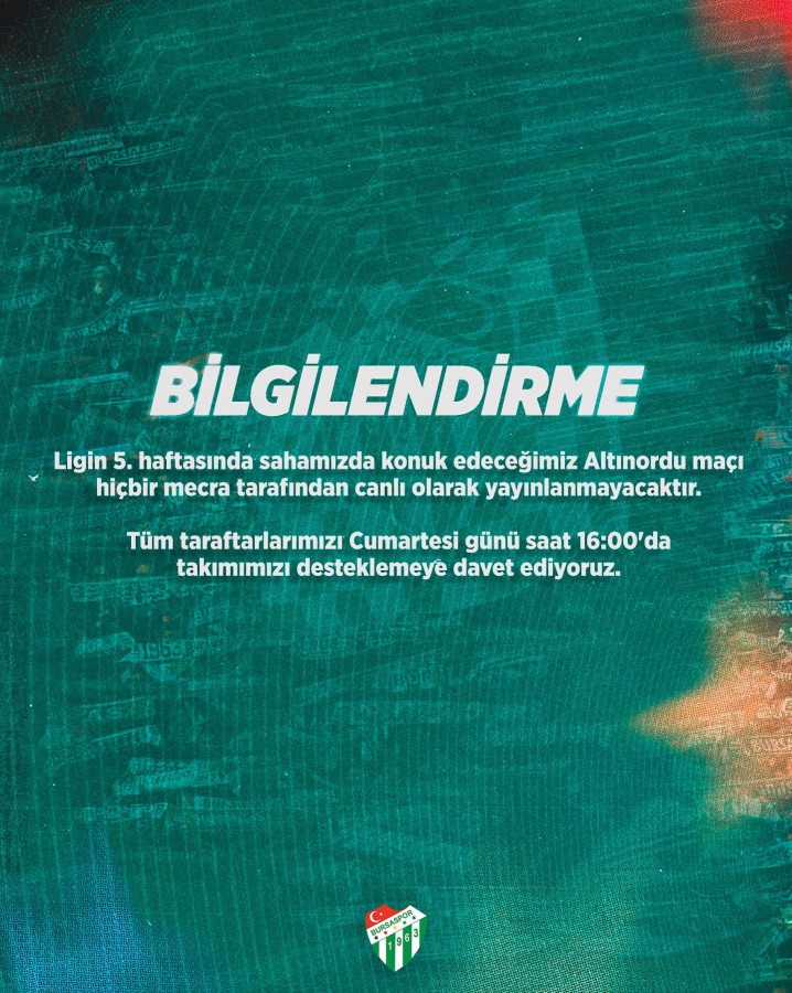"Ligin 5. haftasında sahamızda konuk edeceğimiz Altınordu maçı hiçbir mecra tarafından canlı olarak yayınlanmayacaktır.