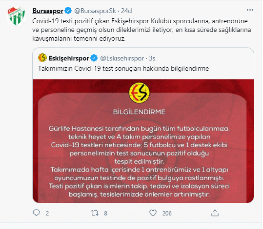 TFF 1. Lig'de yer alan Bursaspor aynı ligde mücadele eden Eskişehirspor için geçmiş olsun mesajı yayımladı. Eskişehirspor'un sporcuları, antrenörleri ve personelinde Covid-19 bulgularının pozitif çıkmasının ardından yeşil-beyazlı kulüp, resmi sosyal medya hesaplarından şu bildiriyi yayımladı: