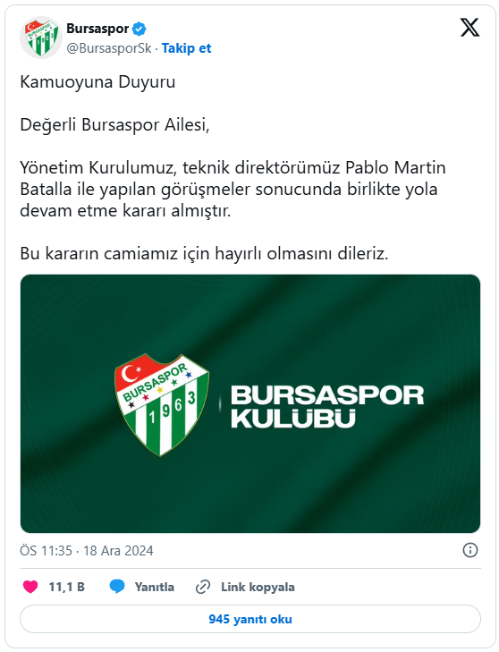 Bursaspor sosyal medya hesabından bir açıklama yaptı. Yapılan açıklamada, "Kamuoyuna Duyuru Değerli Bursaspor Ailesi, Yönetim Kurulumuz, teknik direktörümüz Pablo Martin Batalla ile yapılan görüşmeler sonucunda birlikte yola devam etme kararı almıştır. Bu kararın camiamız için hayırlı olmasını dileriz" dendi.