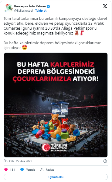 Bursaspor İnfo Yatırım'ın sosyal medya üzerinden yaptığı çağrı şöyle; "Tüm taraftarlarımızı bu anlamlı kampanyaya desteğe davet ediyor; atkı, bere, eldiven ve peluş oyuncaklarla 23 Aralık Cumartesi günü (yarın) 20:30'da Aliağa Petkimspor'u konuk edeceğimiz maçımıza bekliyoruz