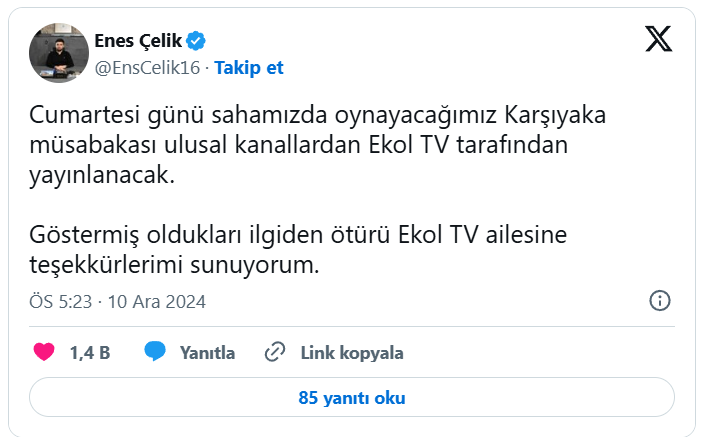 Bursaspor Başkanı Enes Çelik 14 Aralık Cumartesi günü oynanacak Karşıyaka müsabakasının Ekol TV kanalında yayınlanacağını açıkladı. Çelik sosyal medyada yaptığı paylaşımda Ekol TV'ye teşekkür etmeyi de ihmal etmedi.
