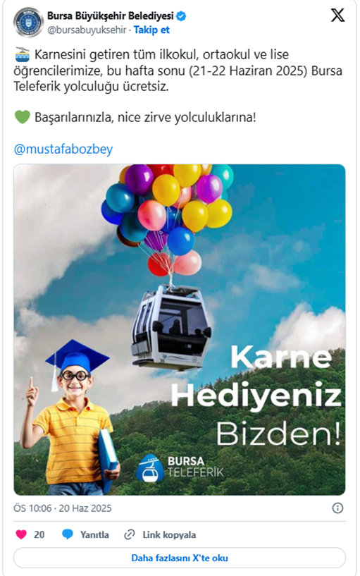 Bursa'da öğrencilere gelen destekler yüzleri gülümsetmeye devam ediyor... Bursa Büyükşehir Belediyesi, 21-22 Haziran tarihlerinde yapılacak YKS için öğrenci ve görevlilere toplu ulaşımı ücretsiz sunacak. Ayrıca yapılan diğer duyuruya göre karnesini getiren tüm ilkokul, ortaokul ve lise öğrencilerine, bu hafta sonu (21-22 Haziran 2025) Bursa Teleferik yolculuğu da ücretsiz... İşte Bursa Büyükşehir Belediyesi'nin duyurusu...
